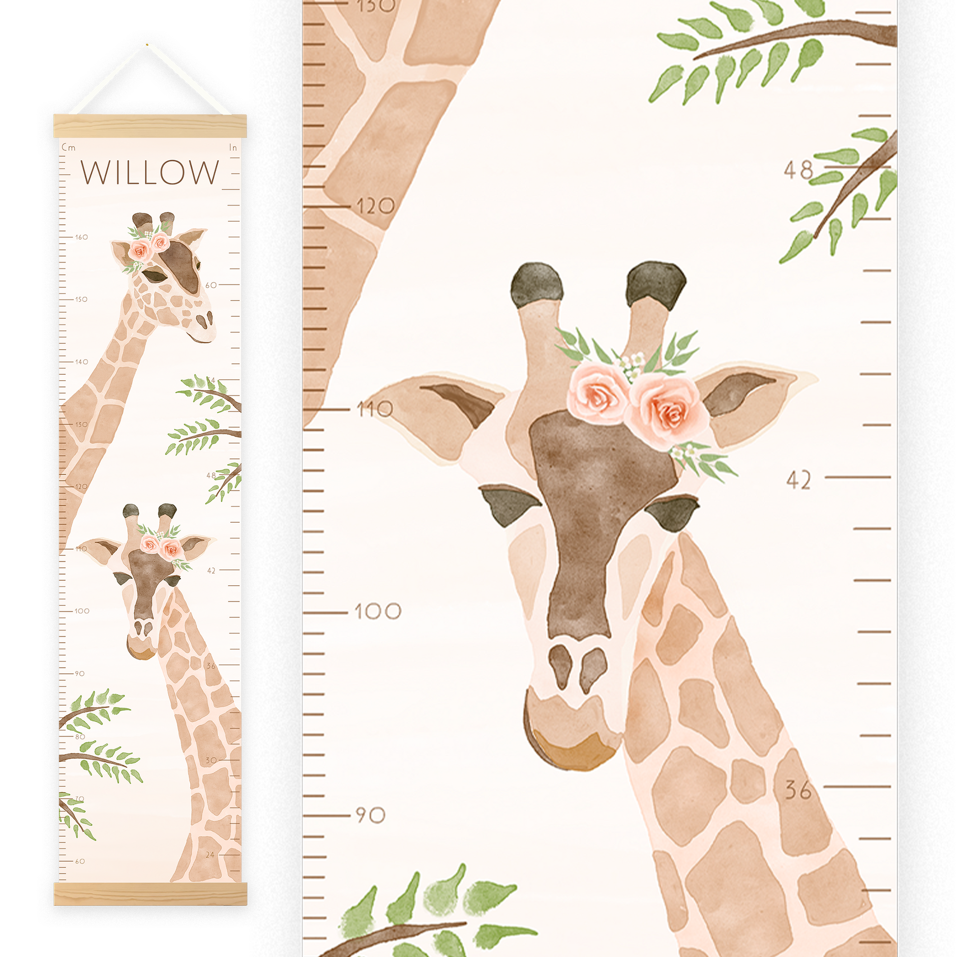 Use this kids growth chart to keep track of your child's ever-changing height and create a keepsake for years to come. Featuring two sweet watercolor-style giraffes with pink flowers adorning their heads, this unique piece will bring warmth and style to your baby's nursery, child's bedroom, playroom, etc. This design will compliment your safari nursery decor, neutral nursery, animal nursery, etc.