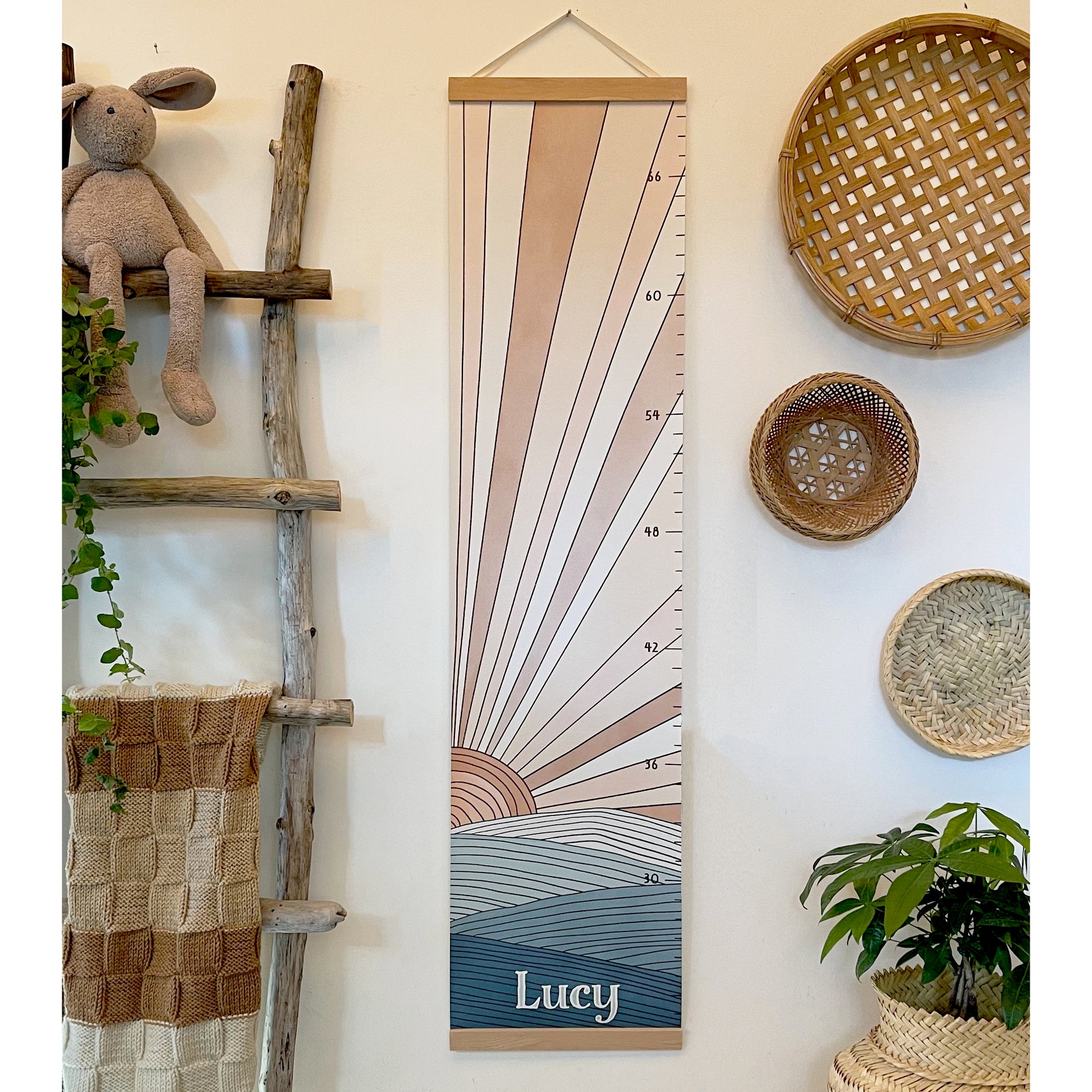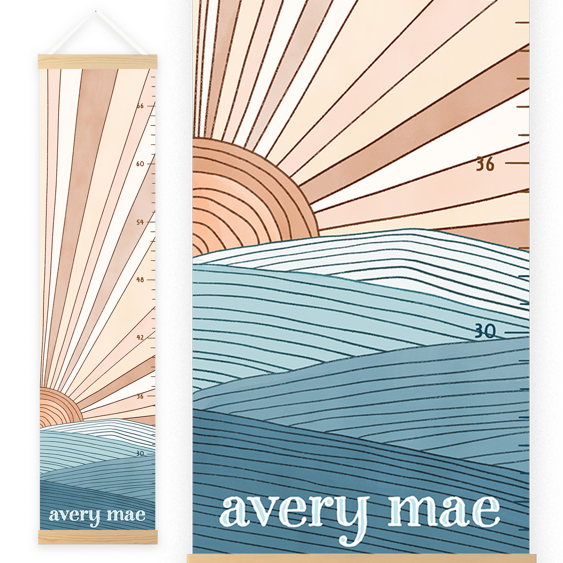 Use this personalized kids growth chart to keep track of your child's ever-changing height and create a keepsake for years to come. Featuring a warm sun rising over peaceful blue ocean waves, this unique growth chart captures the positive vibes and hopeful energy of childhood -- the perfect addition to your boho or ocean themed nursery, surf themed bedroom, playroom, etc.